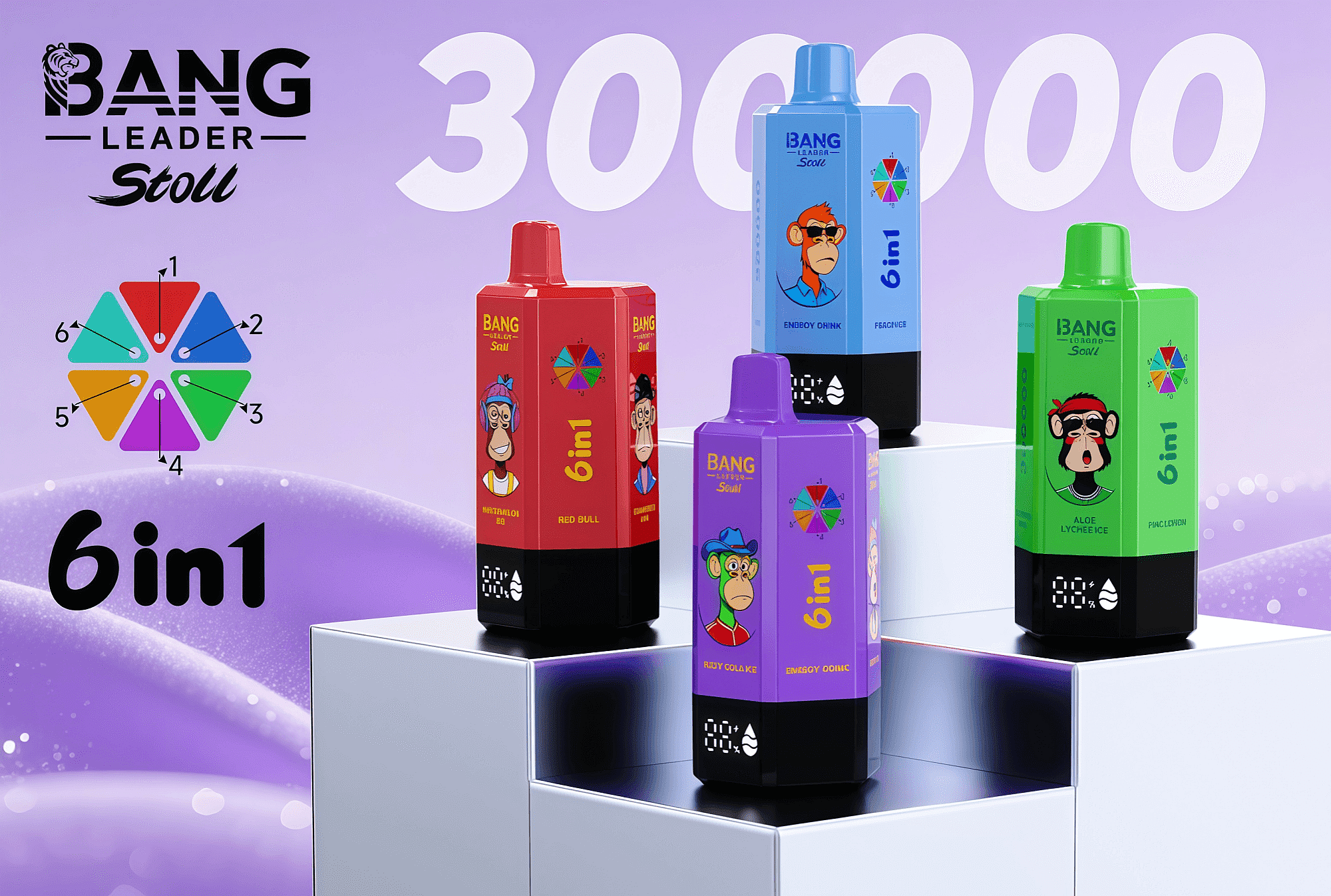 Bang Leader Stoll 300K—a revolutionary 6-in-1 disposable vape engineered for unmatched longevity and flavor purity. With an astonishing up to 300,000 puffs, this flagship device redefines high-capacity vaping through its six fully independent flavor chambers, ensuring zero cross-contamination and crisp, authentic taste from start to finish.