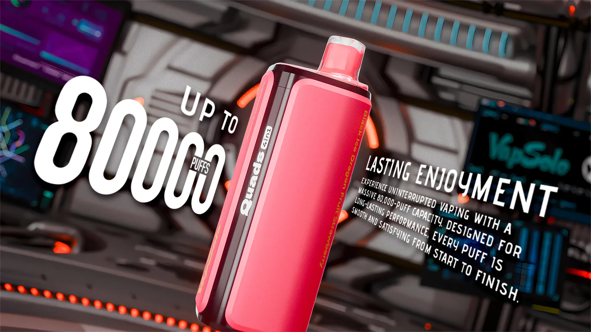 Vapsolo Quads 80000 puffs e-cigarette Boasting an exceptionally long lifespan, a wide range of flavors and an affordable price, Vapsolo Quads deliver an excellent e-cigarette experience. If you are looking for an affordable product without sacrificing quality, Vapsolo Quads combine convenience, high performance and a budget-friendly price, allowing you to enjoy a premium e-cigarette experience without having to pay excessive fees.